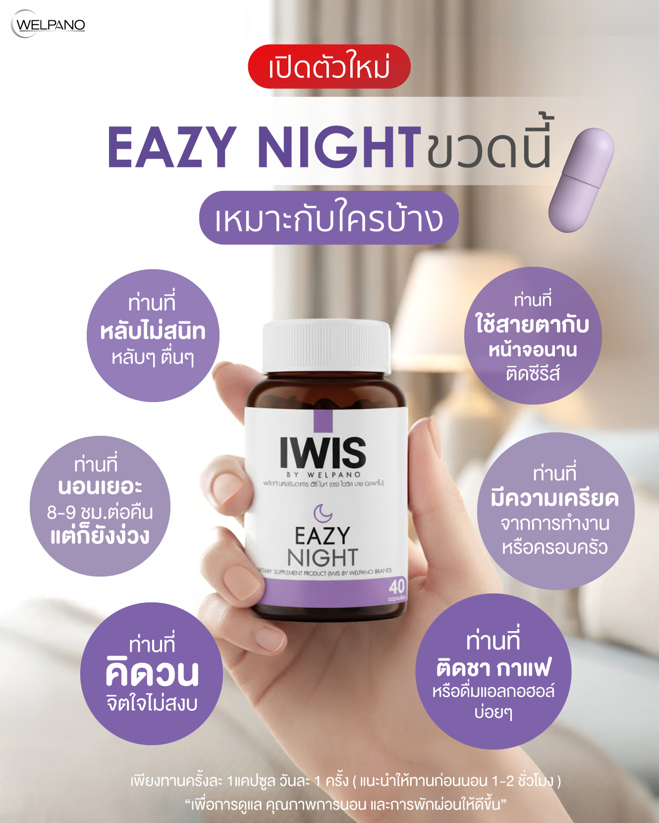 ขอแนะนำ Eazy Night วิตามินดูแลการพักผ่อนจาก IWIS by Welpano สูตรที่รวมสารสกัดธรรมชาติ 4 ชนิด ที่ช่วยให้สมองสงบ และช่วยให้ร่างกายพร้อมเข้าสู่ภาวะพักผ่อนอย่างสมดุล