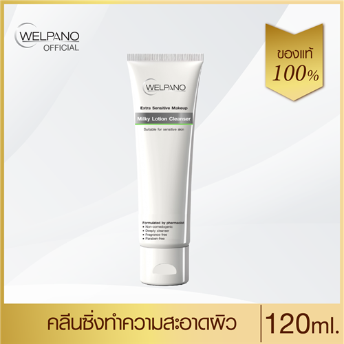 WELPANO EXTRA SENSITIVE MAKEUP MILKY LOTION CLEANSER 120ml โลชั่นเช็ดทำความสะอาดผิวหน้า สำหรับผิวที่แพ้ง่าย จากเวลพาโน่ ช่วยให้สิวอุดตันหลุดออกง่ายยิ่งขึ้น ลดการระคายเคือง พร้อมลดเลือนรอยดำและรอยแดงให้ดูจางลง มอบผิวนุ่มน่าสัมผัส